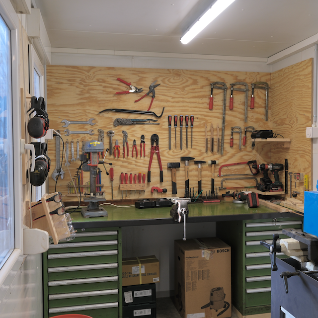 Die Metallwerkstatt besteht aus einem Container, ausgestattet mit verschiedenen Werkzeugen und Maschinen. Im überdachten Aussenbereich können Schweissarbeiten sowie alle Arbeiten mit Funkenflug sicher ausgeführt werden. Dafür stehen ein stabiler Werk- und ein Schweisstisch bereit.